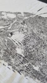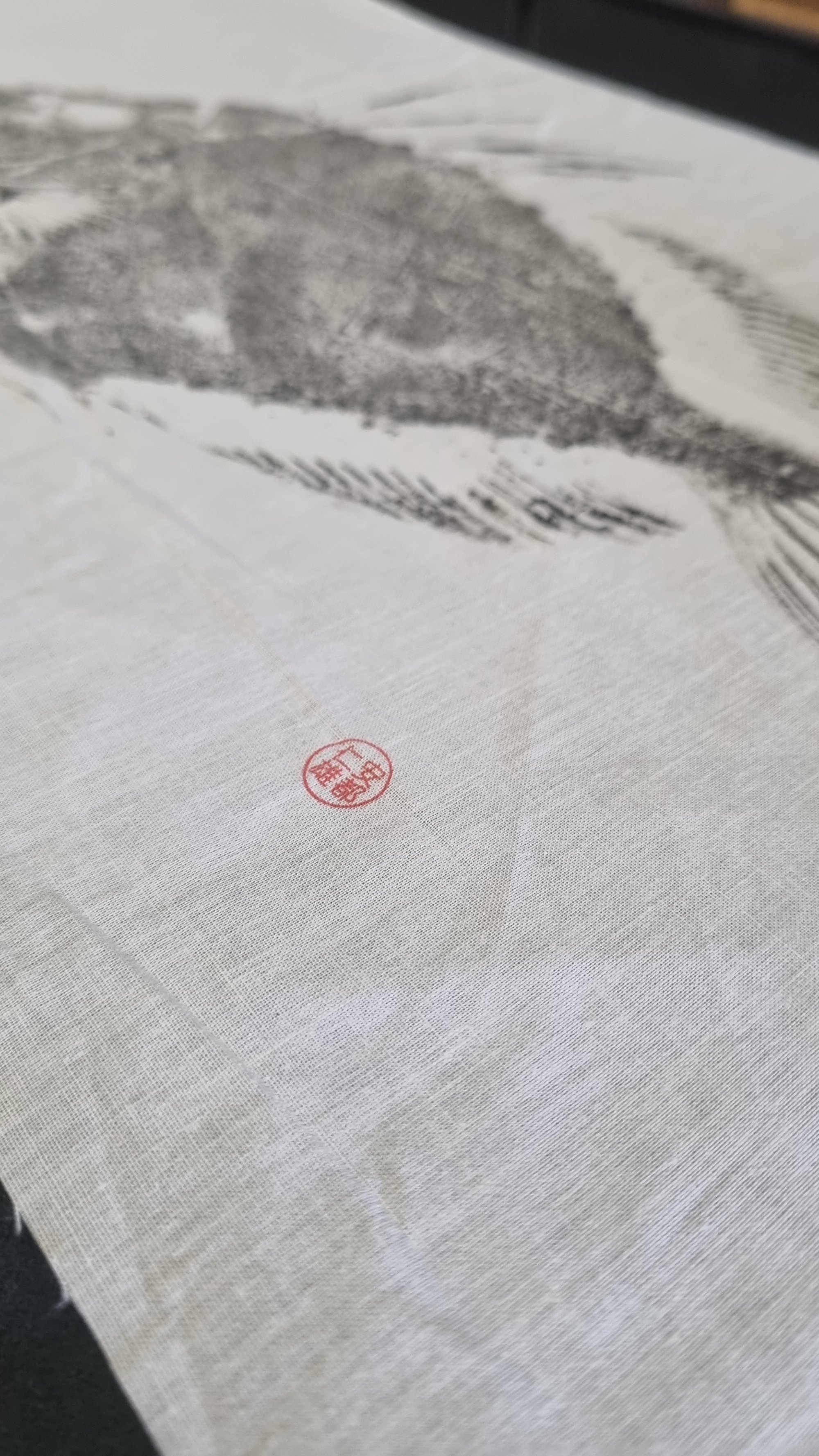 Peixe estampado em tecido 100% algodão com tinta orgânica preta.