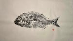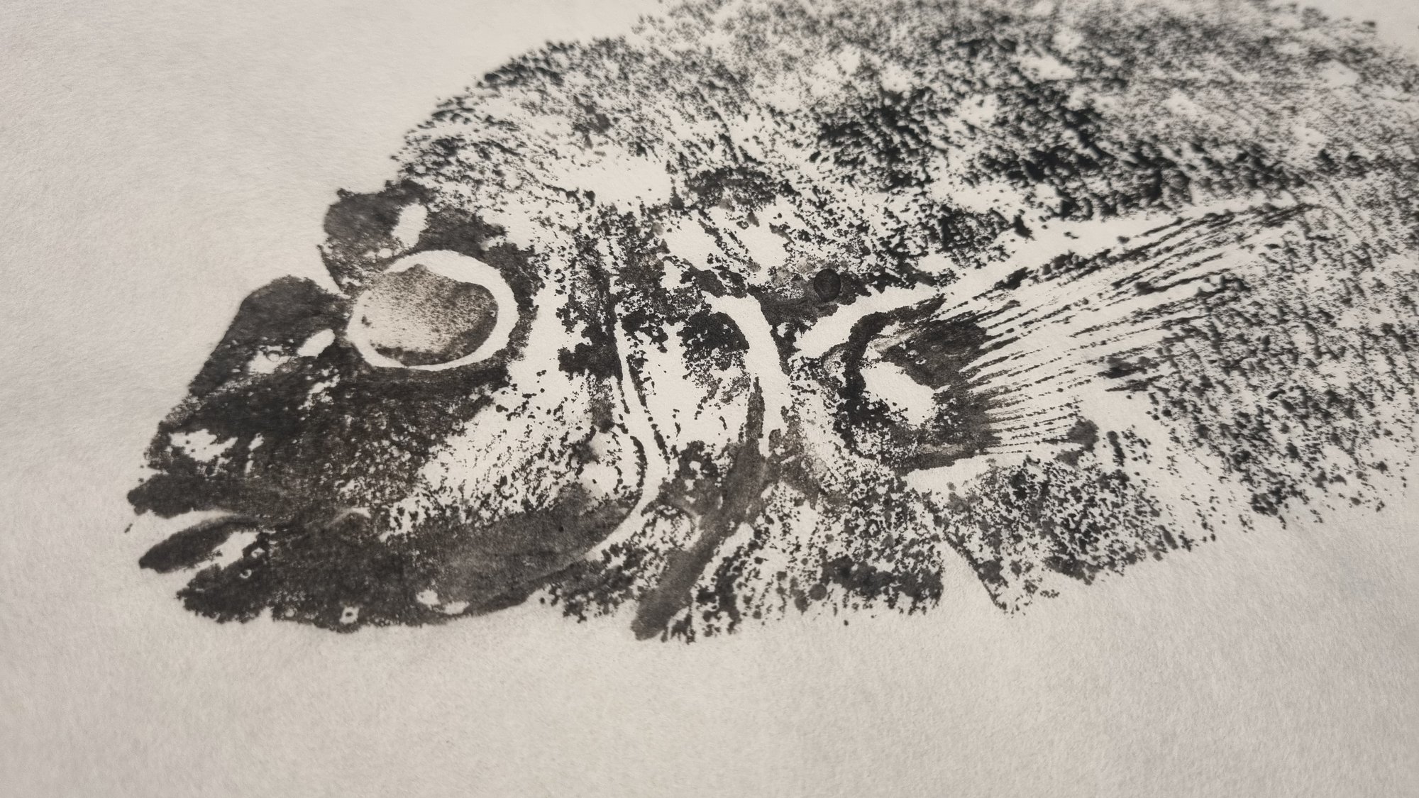 Peixe estampado em papel de arroz com tinta orgânica preta.